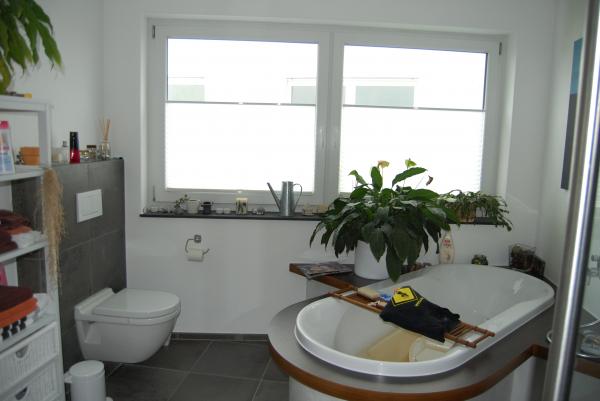 -Das Bad im OG besticht durch eine runde Acrylbadewanne mit Holzablage und eine begehbare Dusche mit Echtglasduschabtrennung,welche den täglichen Gang ins Bad zu einem wahren Wellnesserlebnis werden lassen.